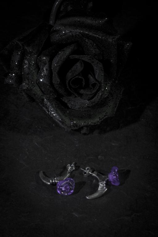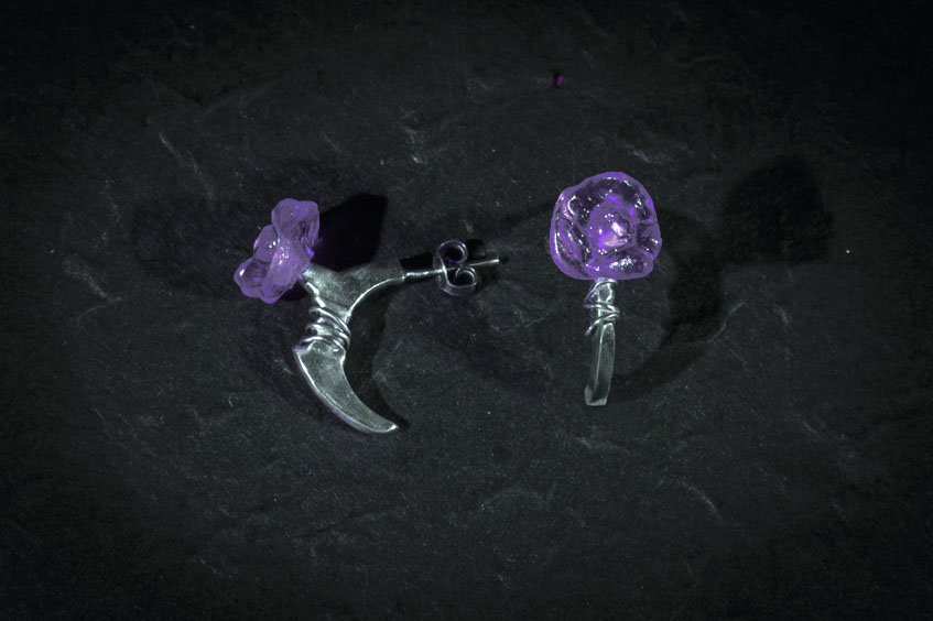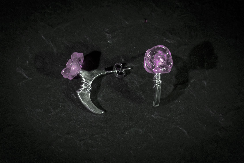 Boucle d'oreille "Tabula" Argent 925/1000 - rose en pâte de cristal (les couleurs lilas et violet sont des couleurs dichroïques, qui deviennent bleu à la lumière blanche).