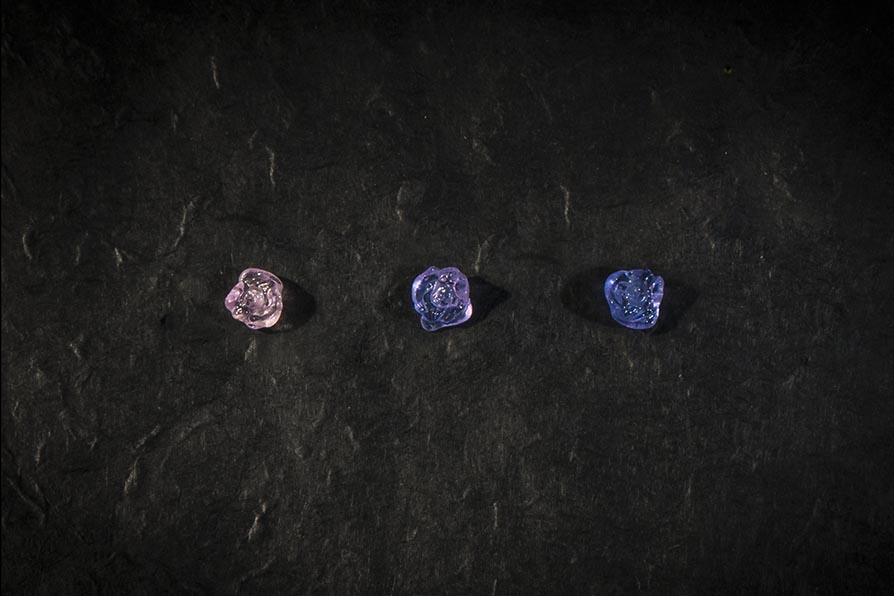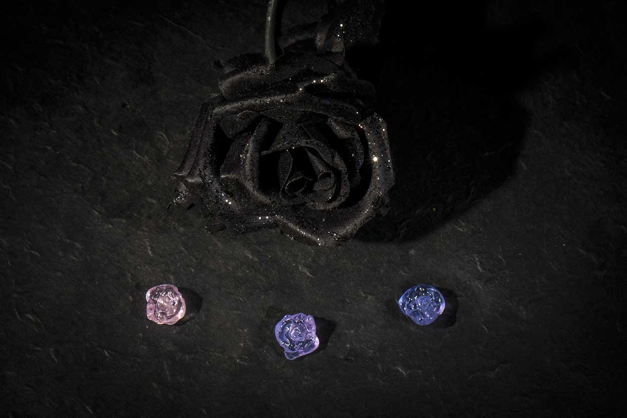 Les roses en pâte de cristal lilas et violet, sont des couleurs dichroïques, qui scintillent en bleu et changent de couleur à la lumière blanche.